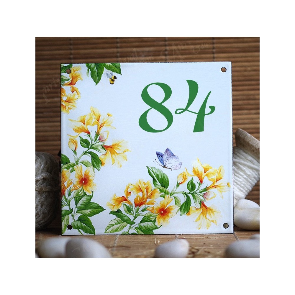 dimensions : Numéro 15x15 cm Couleur de fond : émail blanc pur Numéro : noir, vert, gris, bleu Nombre de trous : 4 Epaisseur de la tôle : 12/10ème Poids : 300 grammes Délai de fabrication : 7 à 10 jours ouvrés selon stock